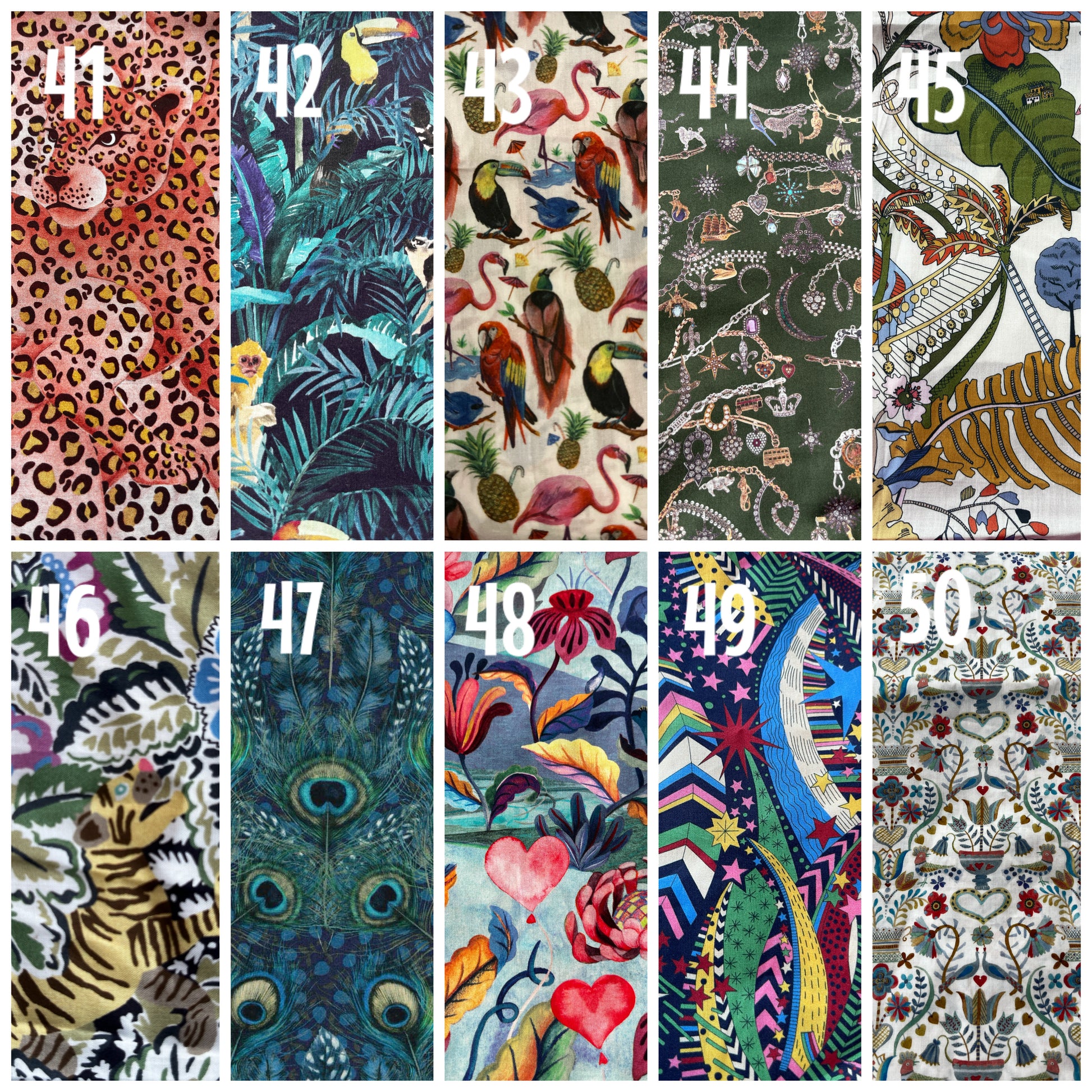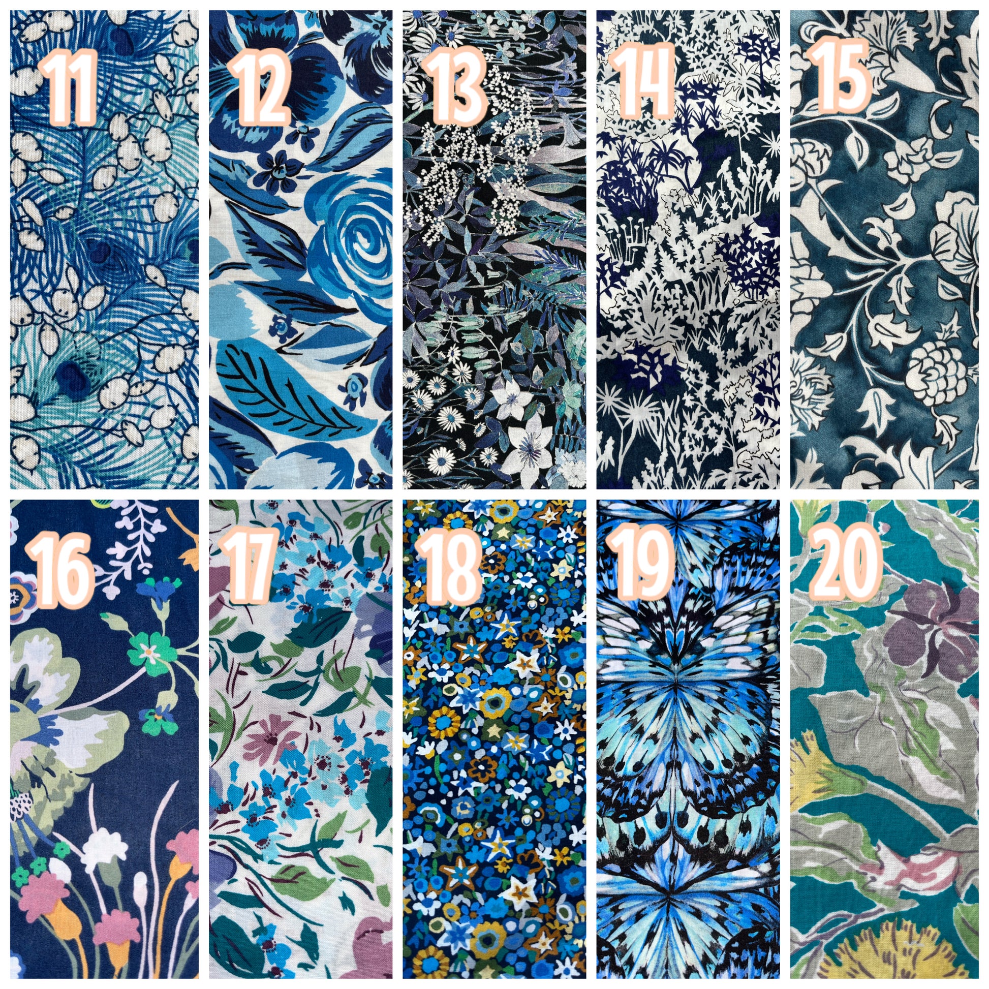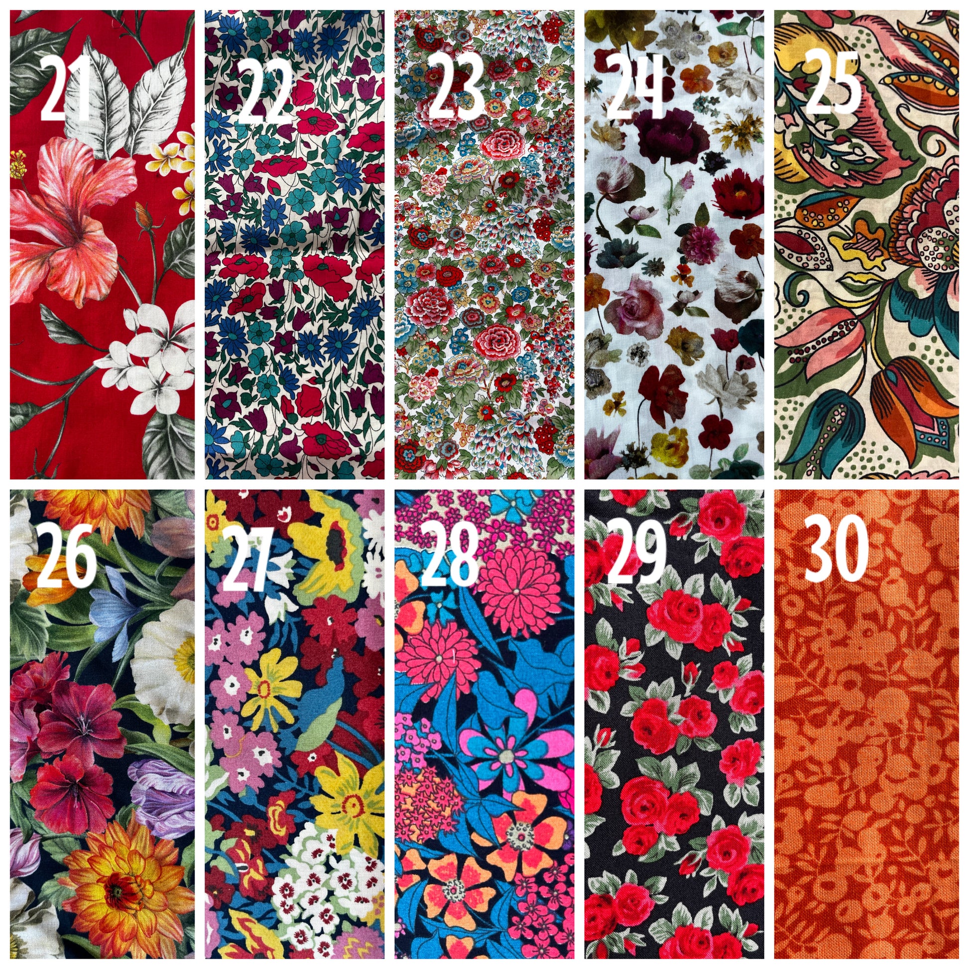 Over 60 different Liberty fabrics to choose from. Some fabrics are only available in small quantities. If you are ordering more than a pair in the same fabric please contact me to ensure that I have enough fabric for your order.
