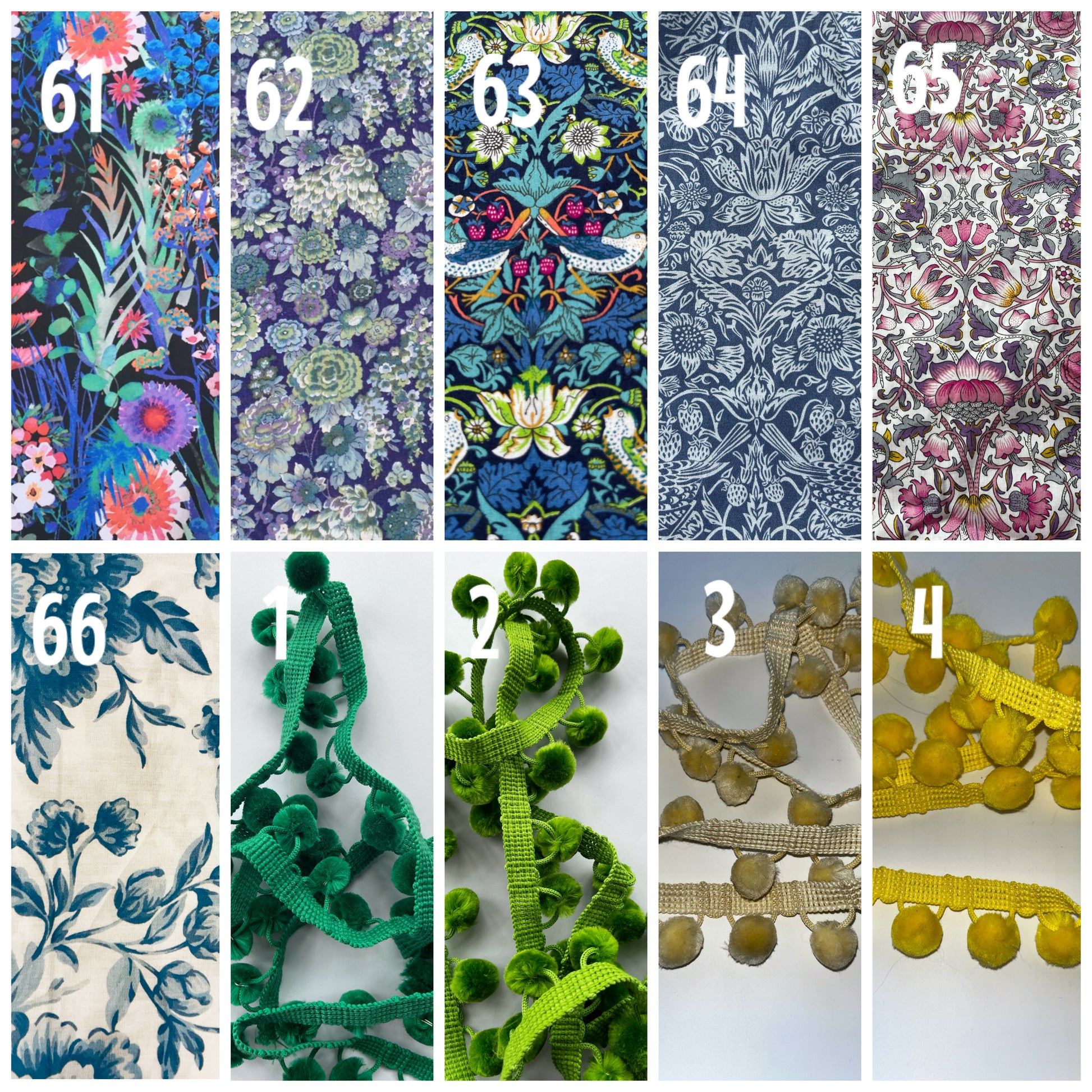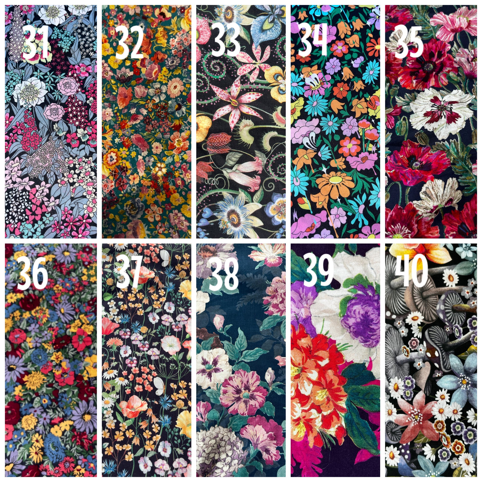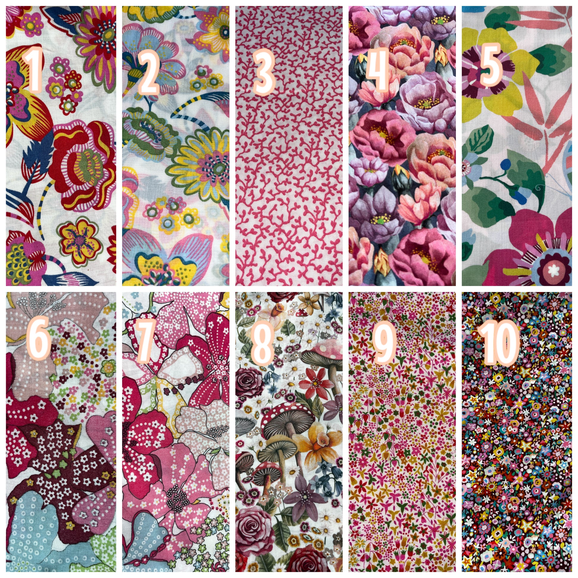 Over 60 different Liberty fabrics to choose from. Some fabrics are only available in small quantities. If you are ordering more than a pair in the same fabric please contact me to ensure that I have enough fabric for your order.
