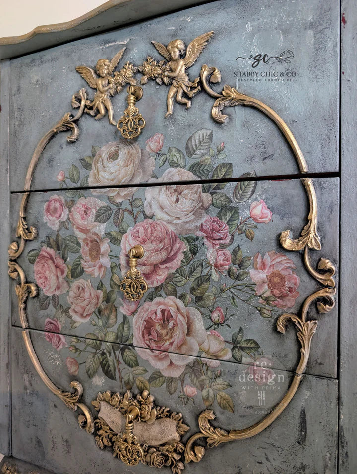 Blushing Blooms Symphony is filled with soft pink roses and trailing greenery, bringing an air of timeless romance to furniture and home Décor. The intricate design can be used as a full composition or cut apart to create custom layouts on dressers, tables, cabinets, and more. With a total sheet size of 24" x 35" divided into four easy-to-use sheets, this transfer allows for seamless application across various surfaces, making every project a work of art.