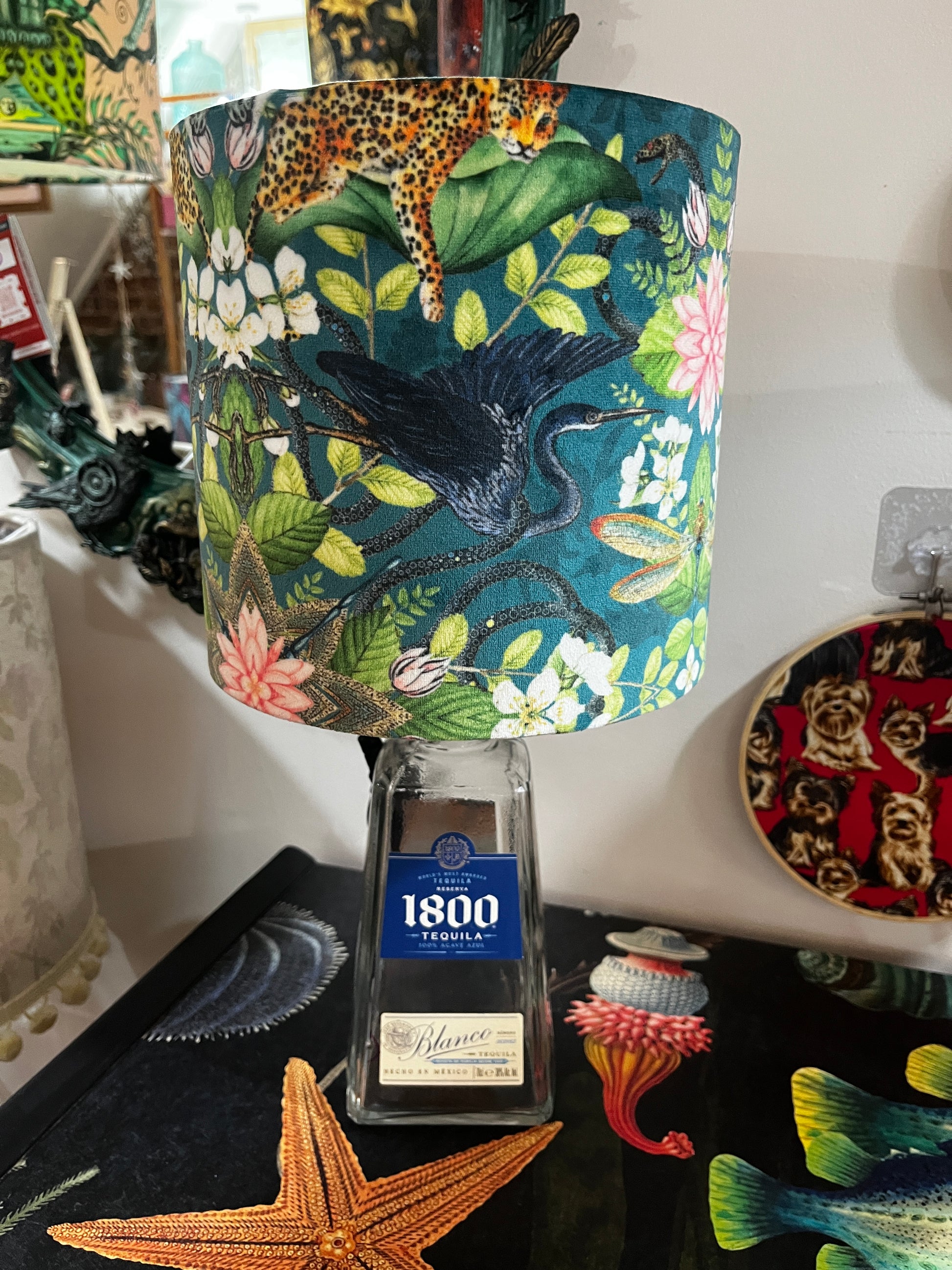 Upcycled 1800 Tequila Bottle lamp with Handmade 20cm velvet Lampshade Botanical Wonders Fabric with Herons, Koi and Leopards
