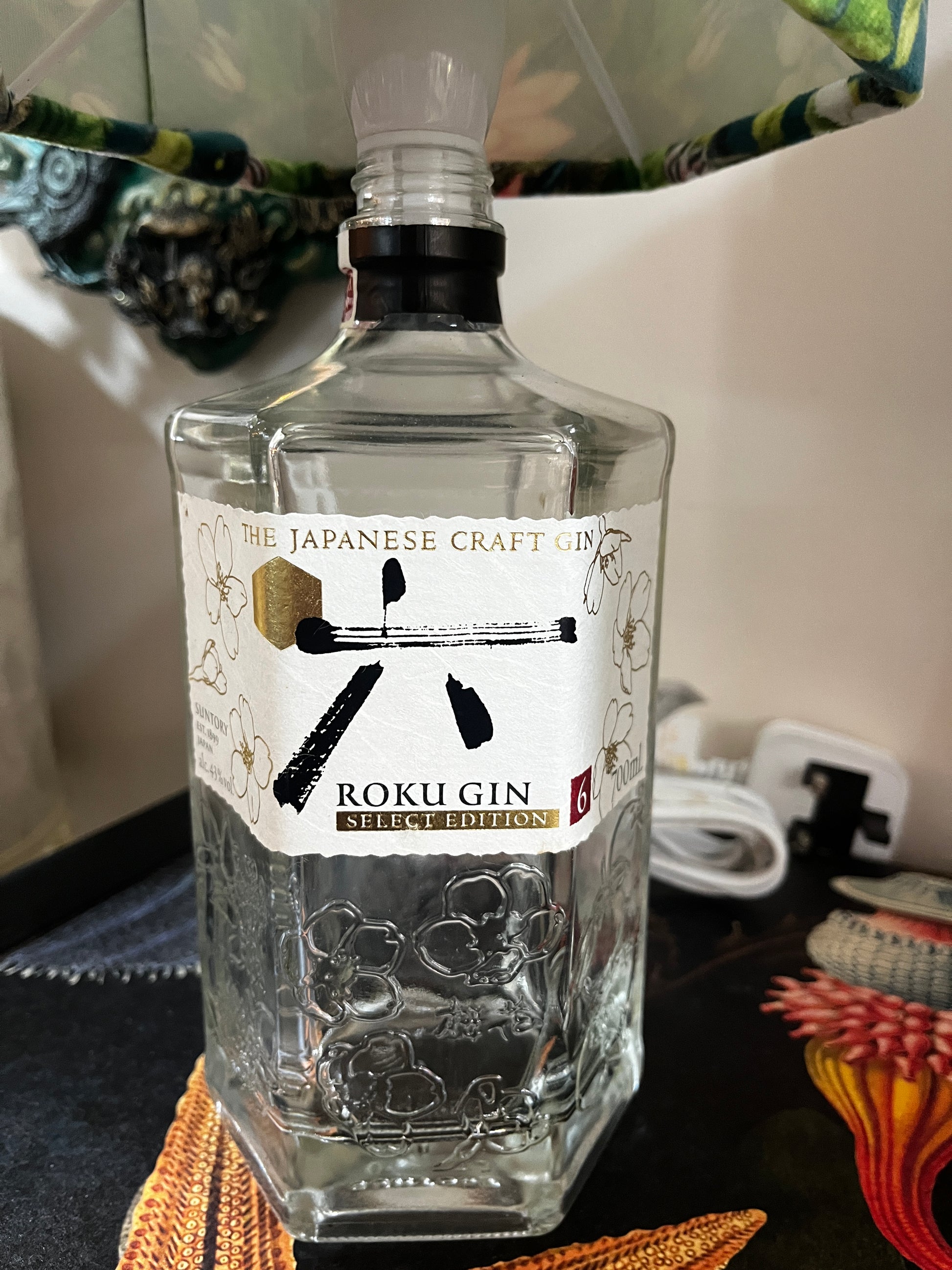 Upcycled Roko Gin Bottle lamp with Handmade 15cm Hexagonal Velvet Lampshade Botanical Wonders Fabric, with Koi and Herons
