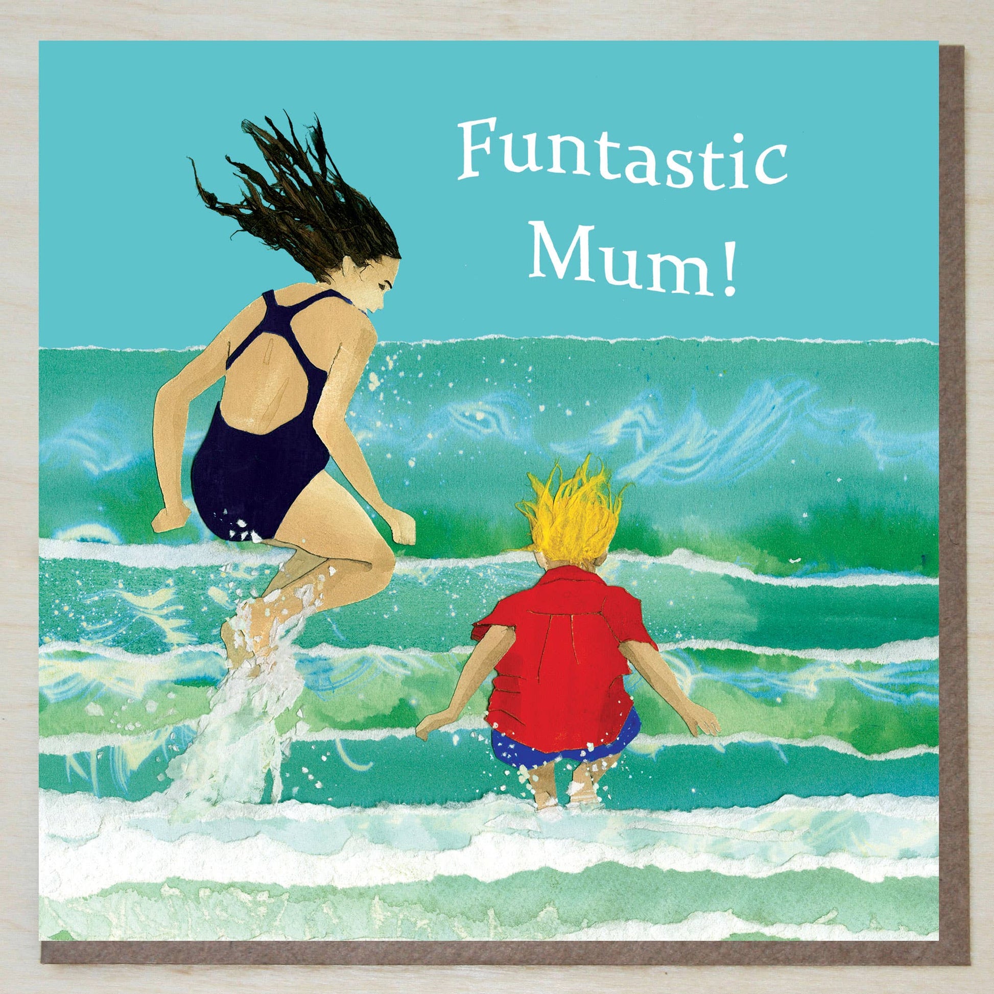 'Funtastic Mum' Birthday or Mother's Day card with a vibrant image of a mum jumping waves with a young child.