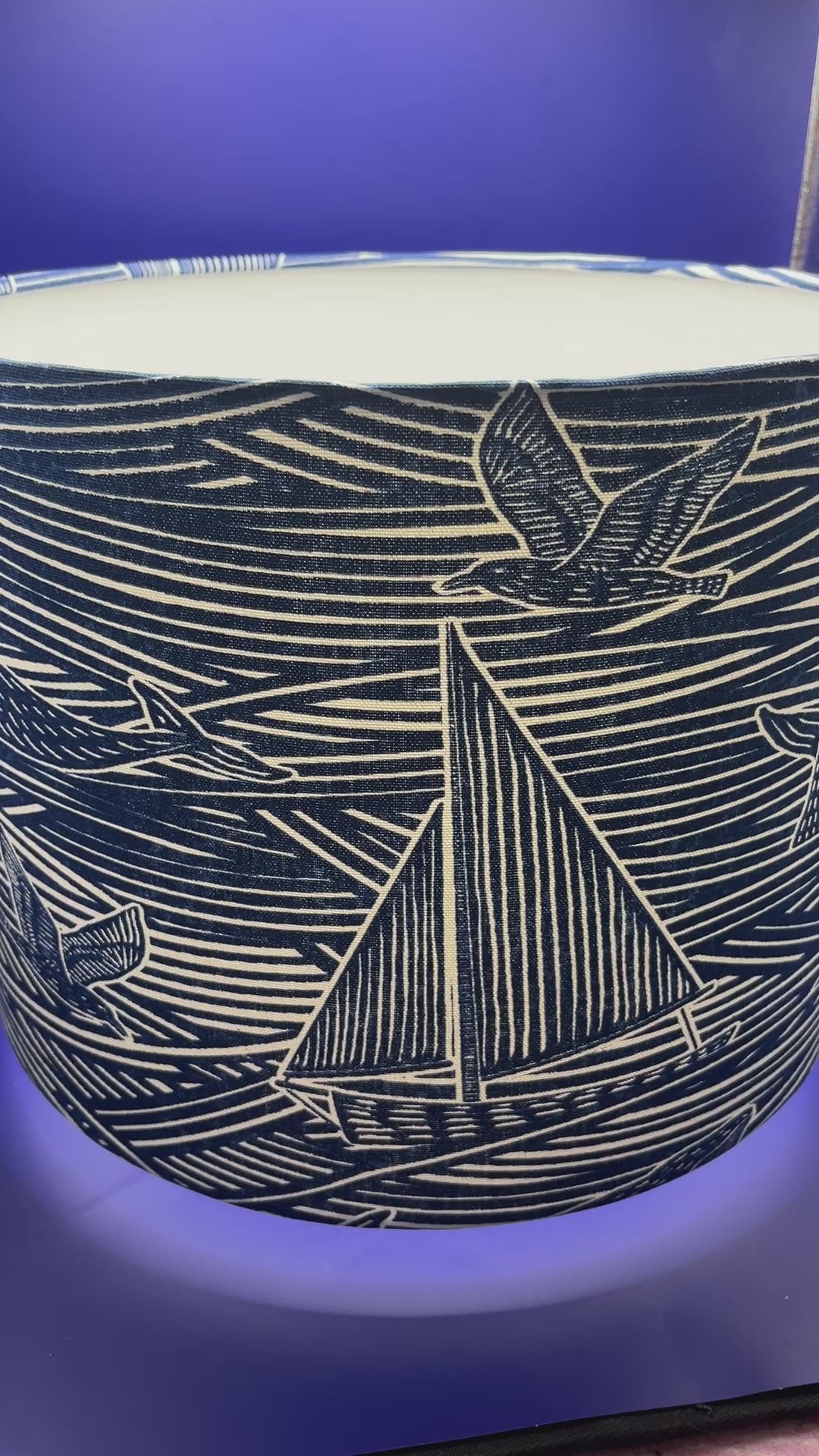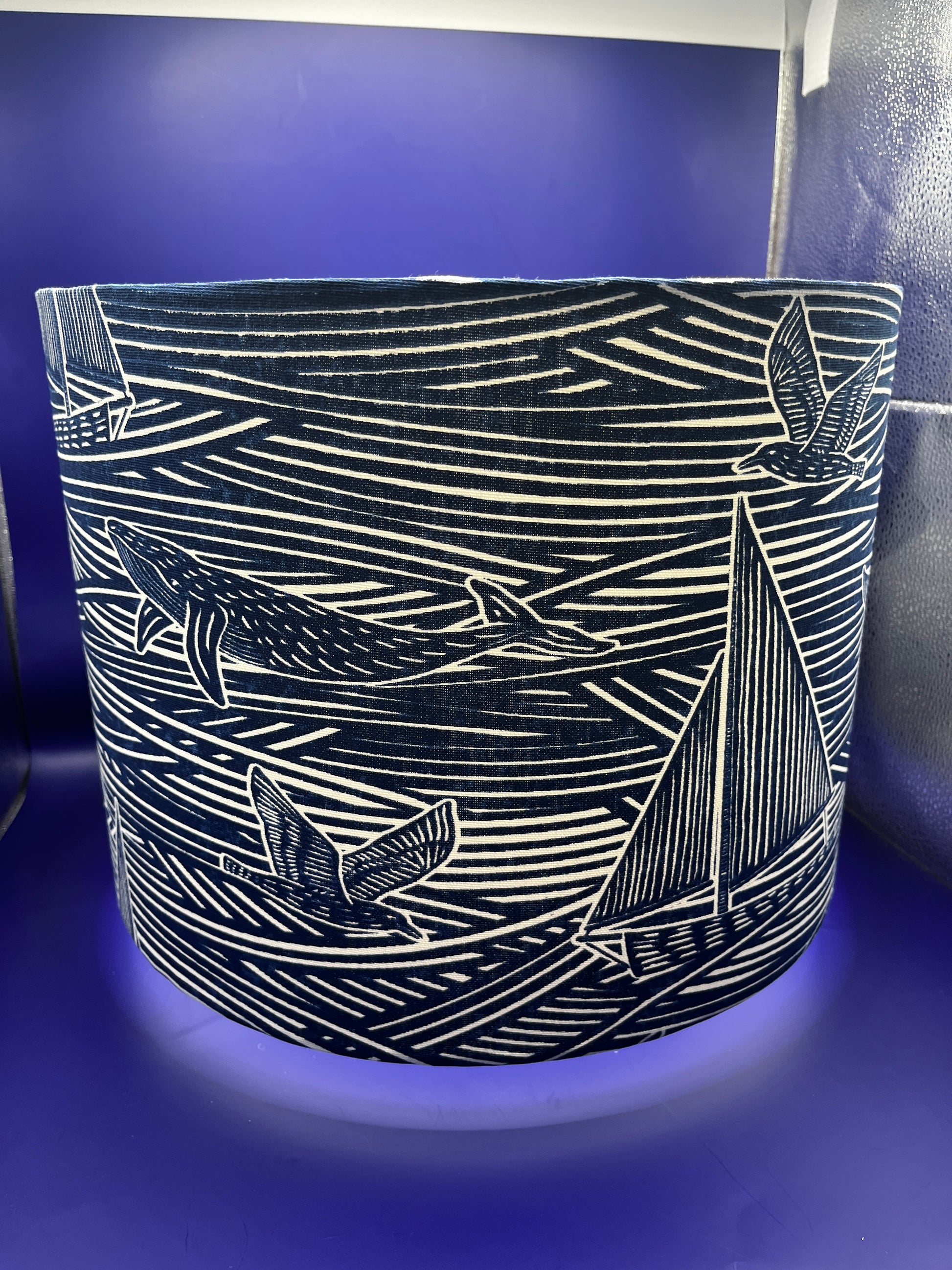 Fin is a truly modern take on an ocean scene, the abstract waves of the sea, layered with boats and whales is an ocean dream in a monochromatic colour, linocut for a stylish effect, all lampshades are to order