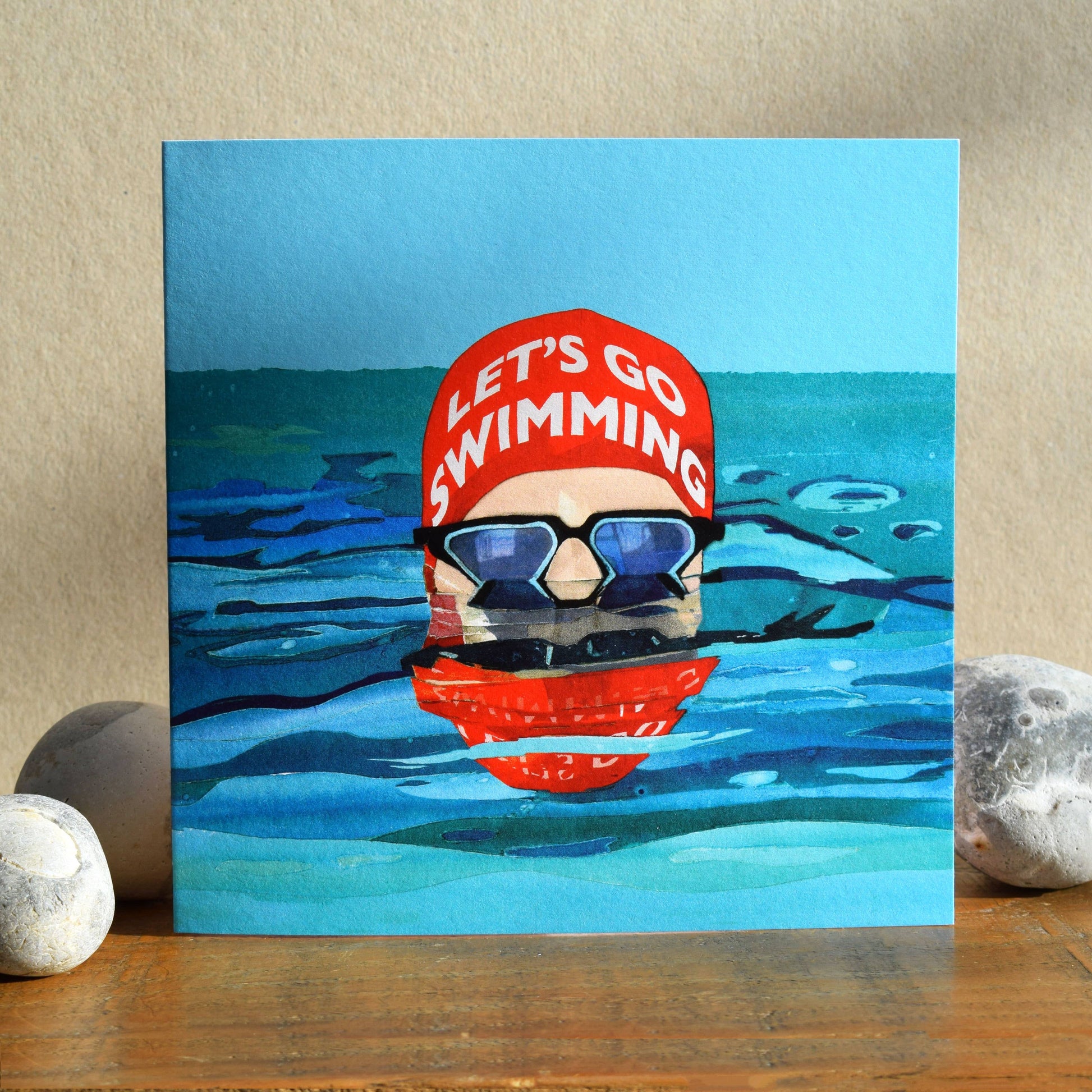 Wild swimming card showing a swimmer's face and goggles emerging from the water.