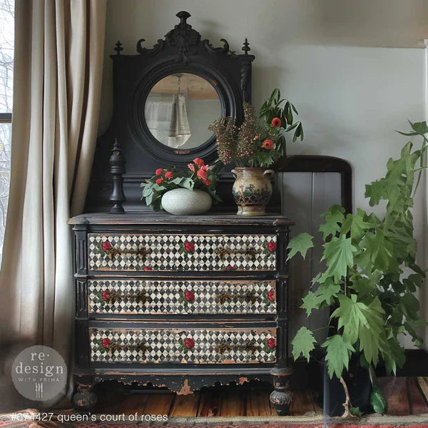 Bring a royal touch to your projects with the Queen’s Court of Roses Découpage Décor Tissue Paper®! Imagine the Queen of Hearts herself inspecting these perfectly painted roses, set against a classic black-and-white harlequin pattern. This design blends the drama of Wonderland’s most famous queen with a timeless elegance, making every piece you create feel like it’s straight out of her court. The rich reds and bold contrasts give your furniture a regal makeover that’s both striking and sophisticated. Transform your pieces with this durable, tear-resistant tissue paper that’s as powerful as the Queen herself. The textured finish makes it easy to work with, ensuring those deep reds and crisp patterns stay vibrant and flawless. Whether you’re adding a touch of royalty to a dresser or crafting a unique accent.