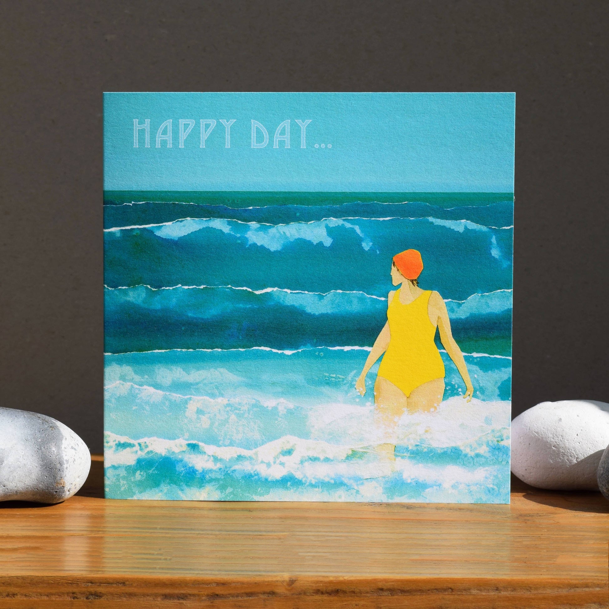 'Happy Day' wild swimming card, showing a woman coming out of the sea, after a swim.