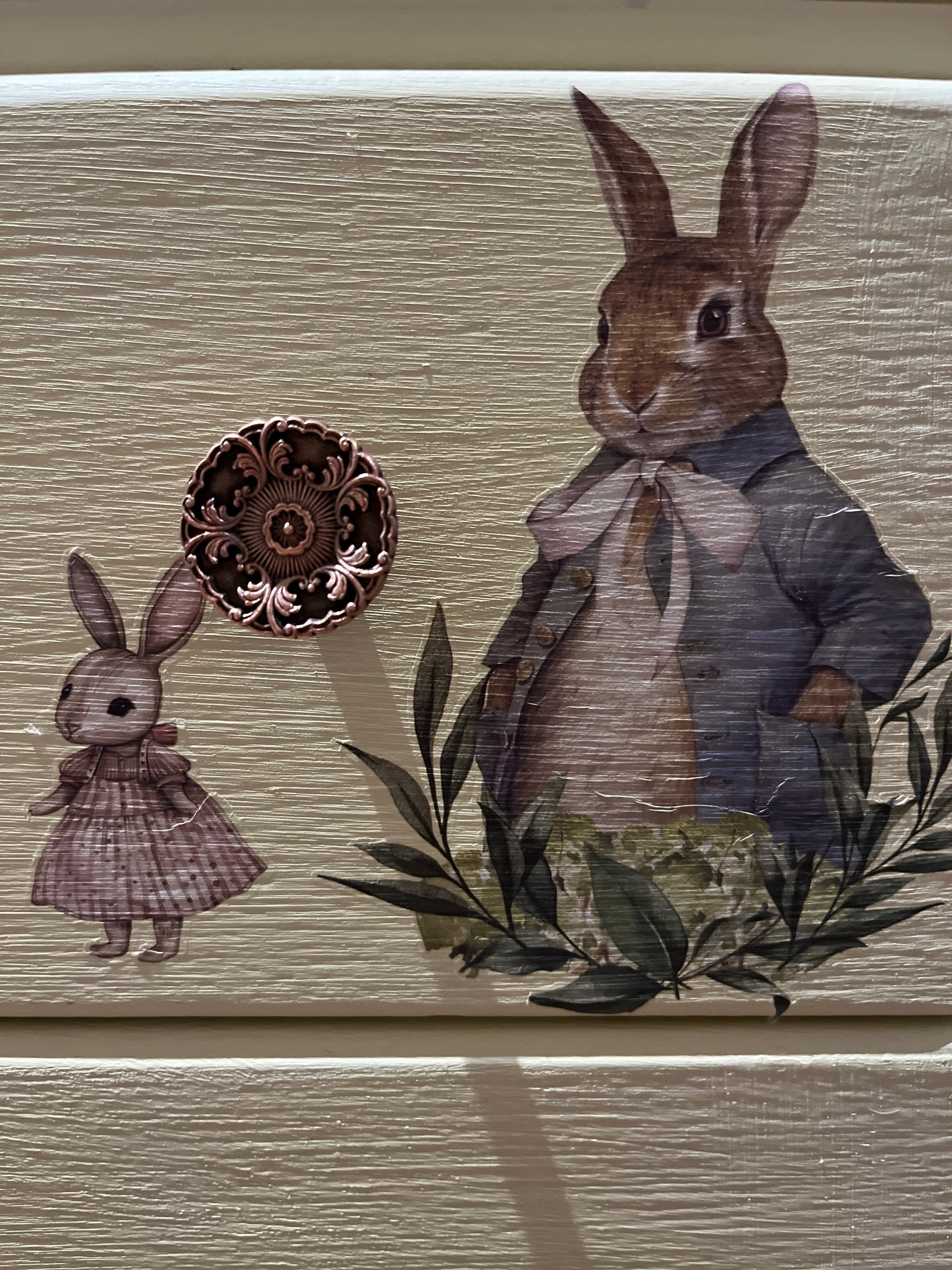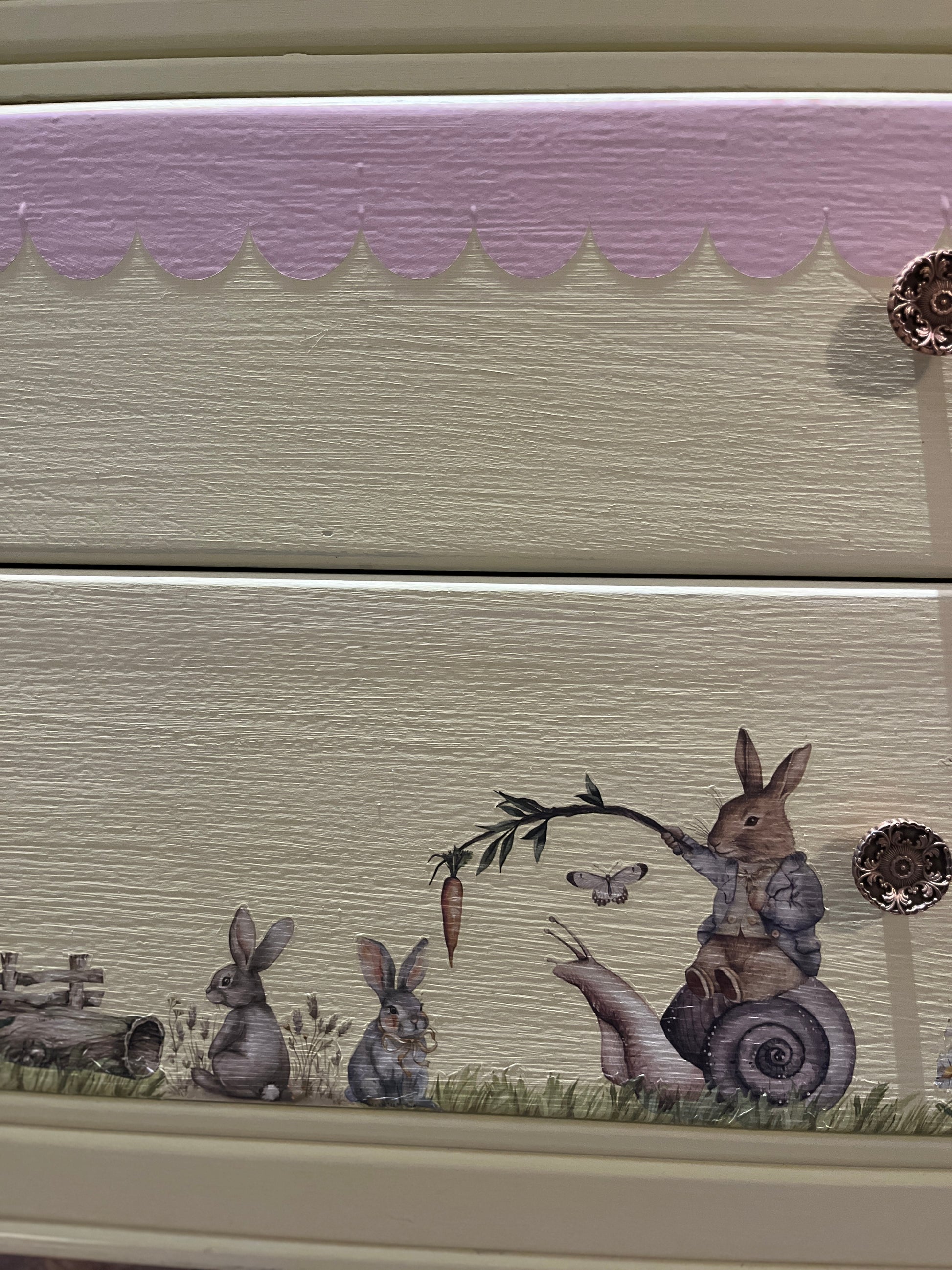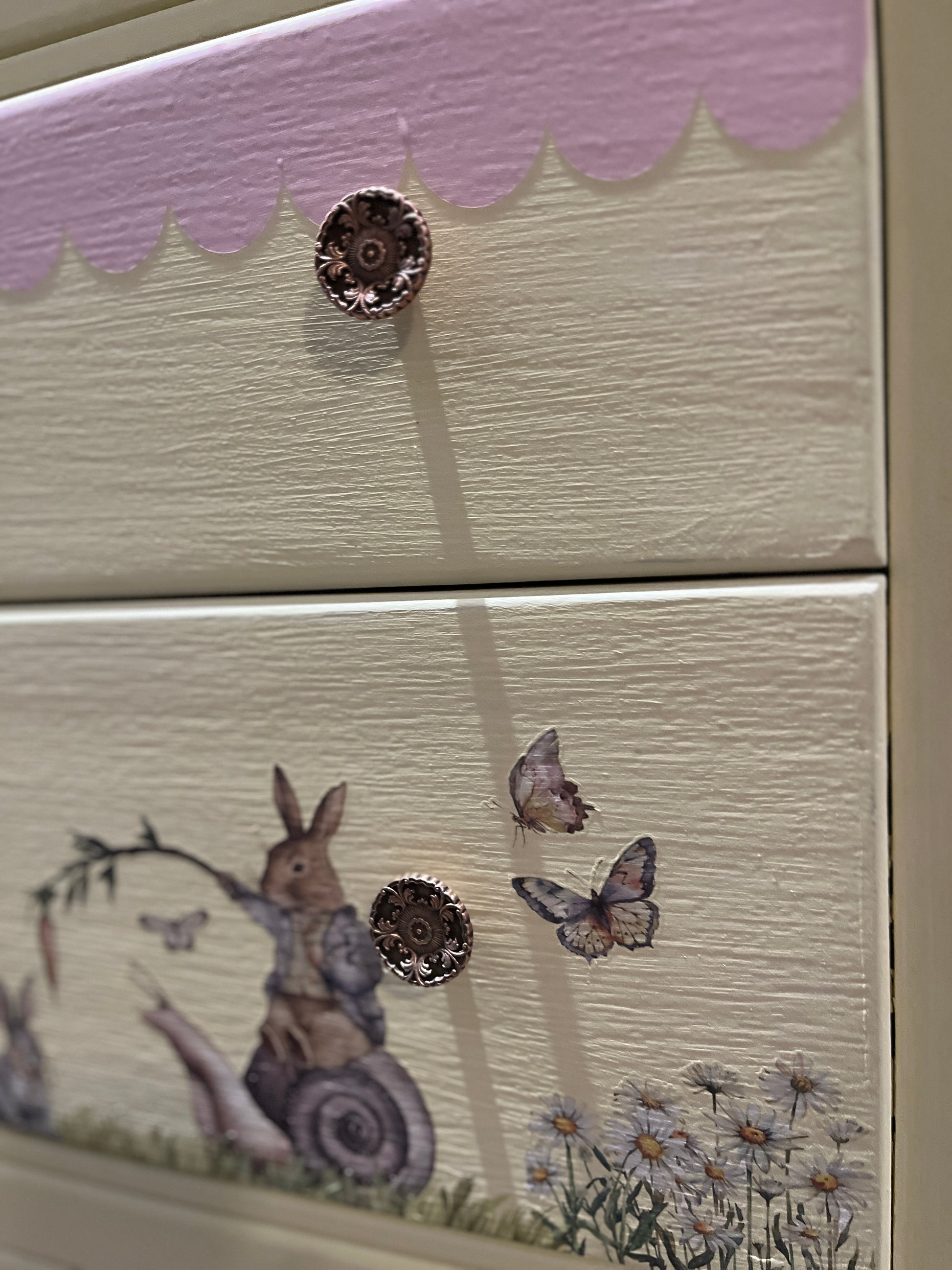 This is such a sweet little Lebus set of drawers and dressing table. They have been reimagined using Bunny Trails Transfers by Redesign with Prima all sealed with Tuff Top Coat. The drawers have been painted with Frenchic paint. The top has been sanded back and given a lime wash look with Wedding Cake from the Al fresco range and Tuff Top Coat. The original handles cleaned up beautifully. The mirror shows signs of age with foxing, I have used Springtime Bunny moulds and painted the bunnies to add a bit of fun to the mirror. The mirror could easily be removed if not required to make a pair of drawers.
