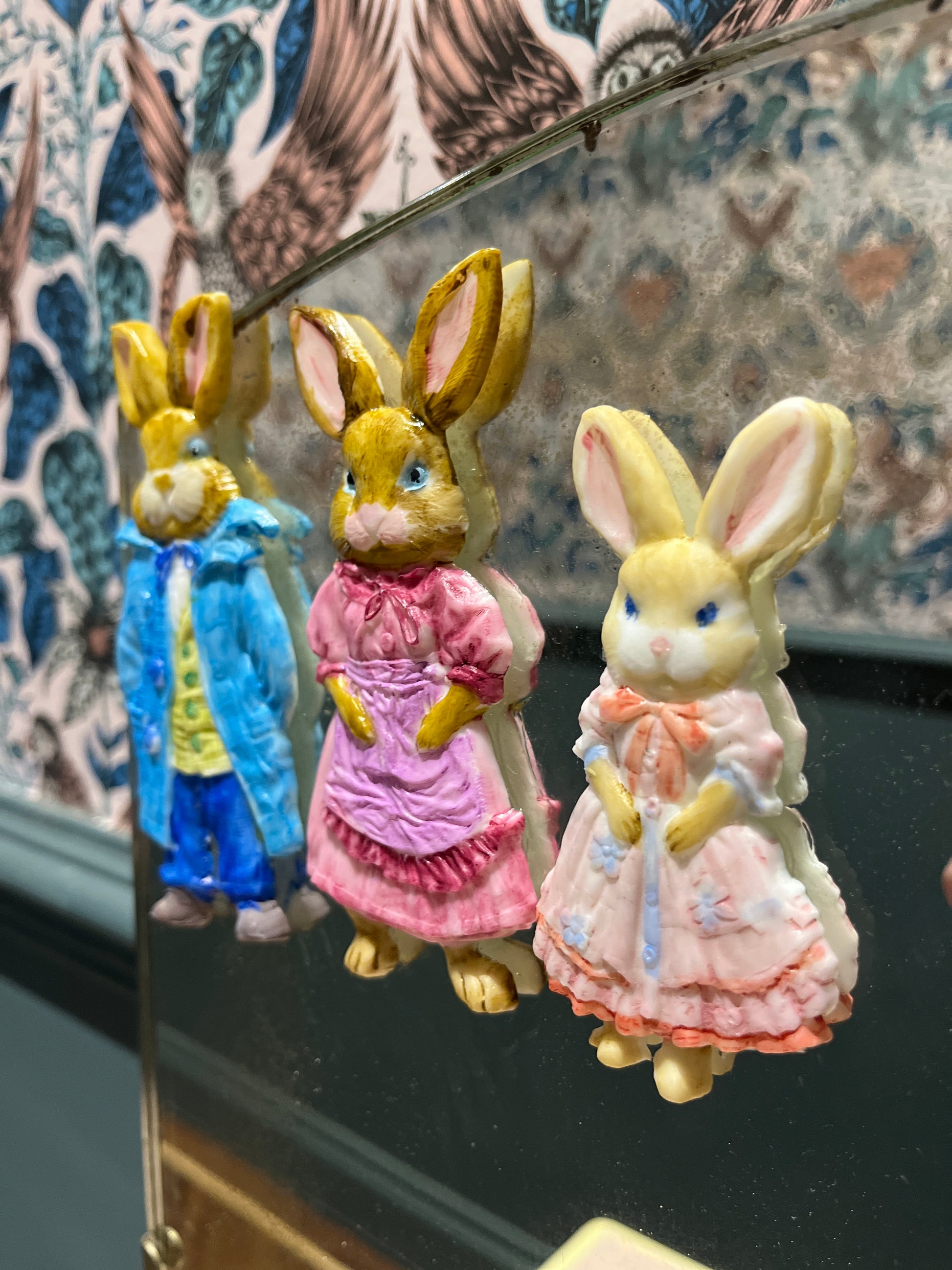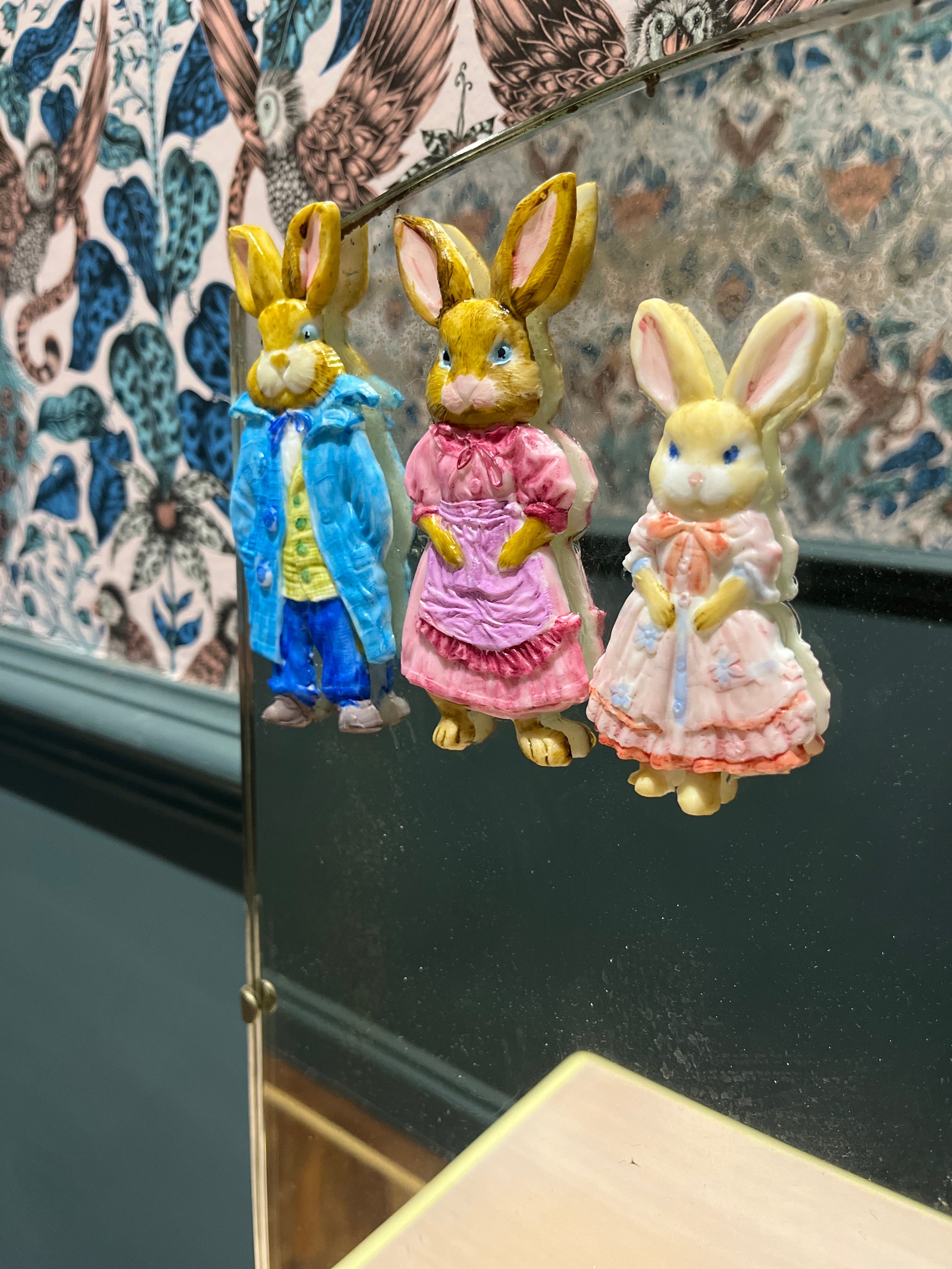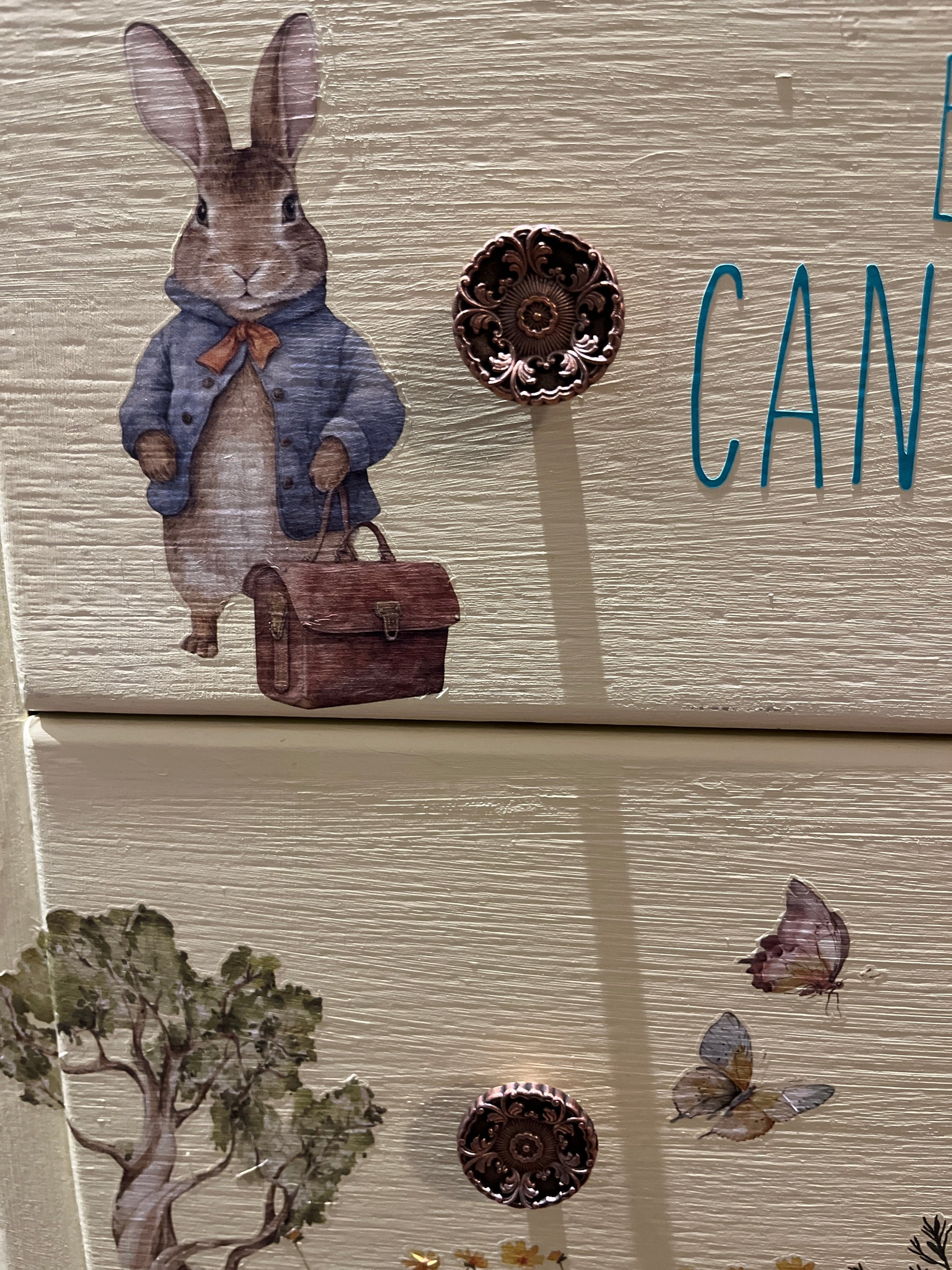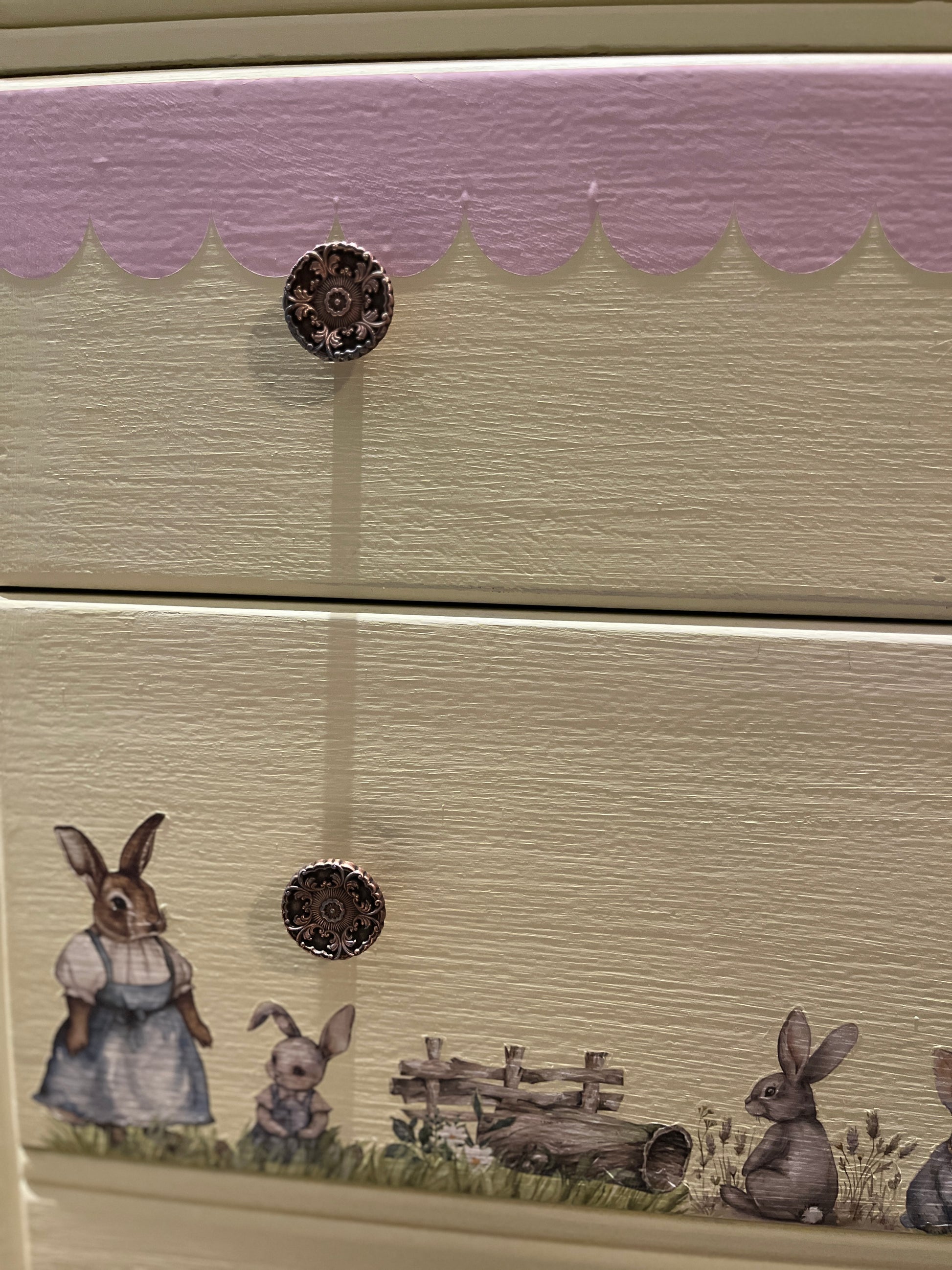 This is such a sweet little Lebus set of drawers and dressing table. They have been reimagined using Bunny Trails Transfers by Redesign with Prima all sealed with Tuff Top Coat. The drawers have been painted with Frenchic paint. The top has been sanded back and given a lime wash look with Wedding Cake from the Al fresco range and Tuff Top Coat. The original handles cleaned up beautifully. The mirror shows signs of age with foxing, I have used Springtime Bunny moulds and painted the bunnies to add a bit of fun to the mirror. The mirror could easily be removed if not required to make a pair of drawers.