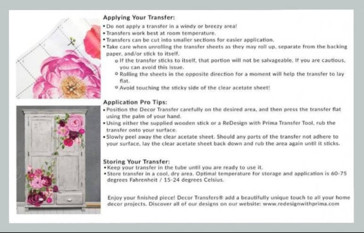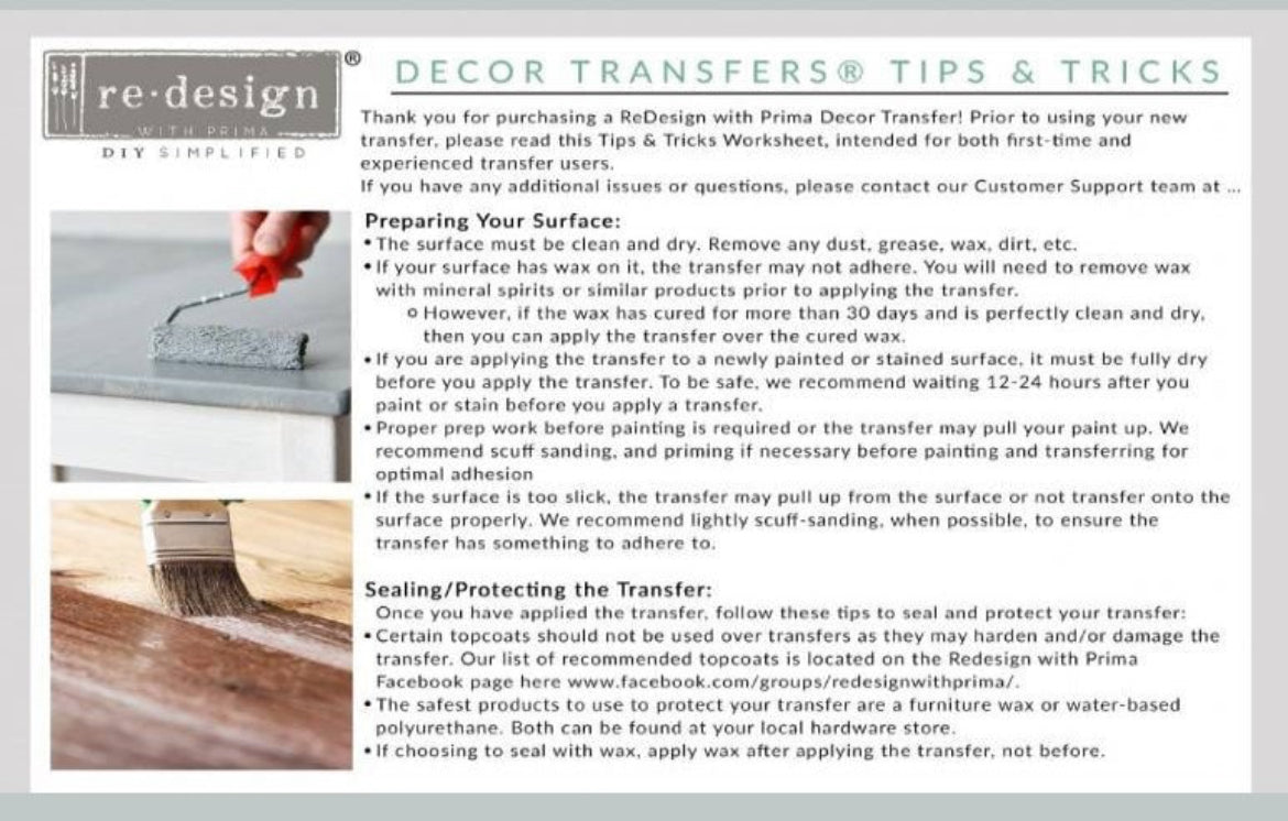 Our transfer is so easy to use: simply peel off the protective backing, apply transfer to the prepared surface, rub on the design with an included stick (or use our Transfer Tool), peel off the top sheet (check to make sure the whole design transferred), and burnish to remove any existing halos. Look for the BEST selection of Décor Transfers in the world, now in multiple sizes, only from Redesign with Prima®!