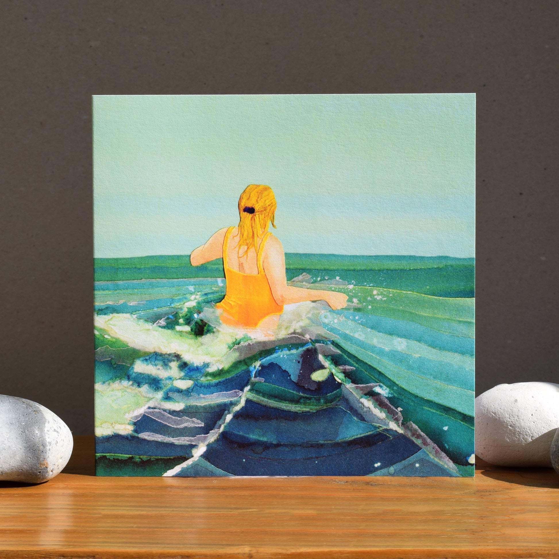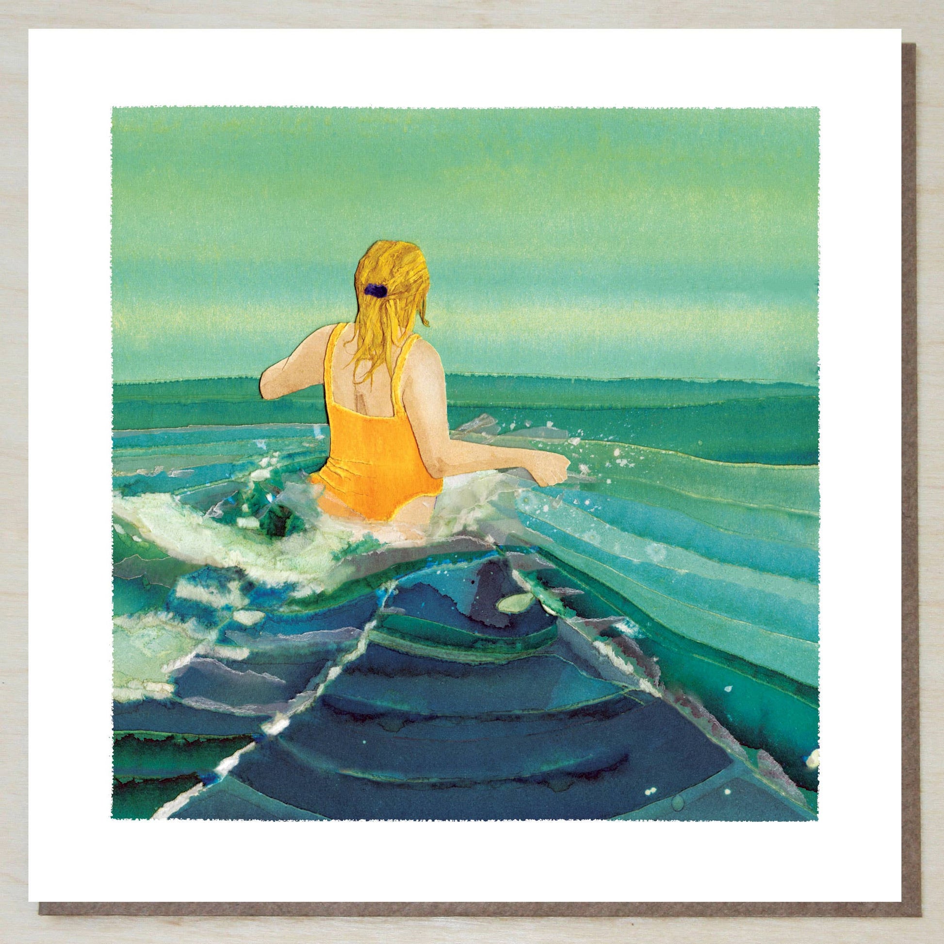 Atmospheric sea swimming card, with a bit of an 'end of the day' glow... showing a woman entering the sea. Lovely for wild swimmers.
